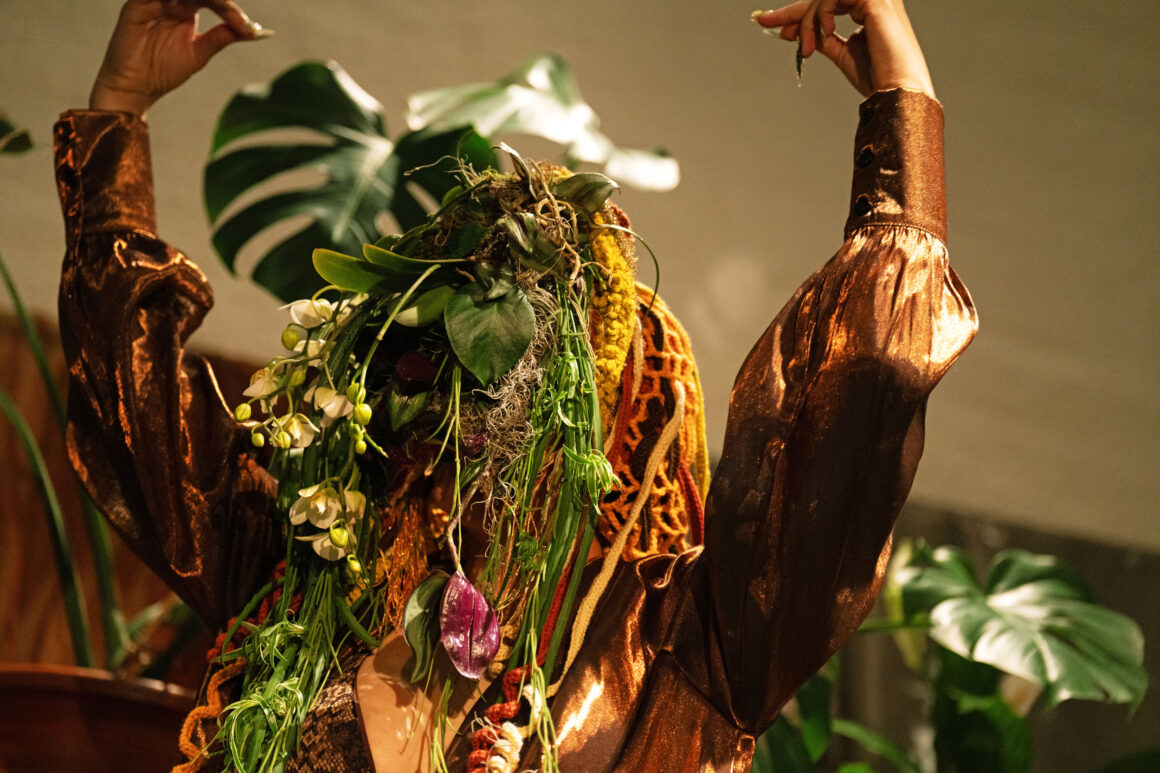 Pflanzenarrangement auf der Maske von Meisterfloristin Antonia García Moser