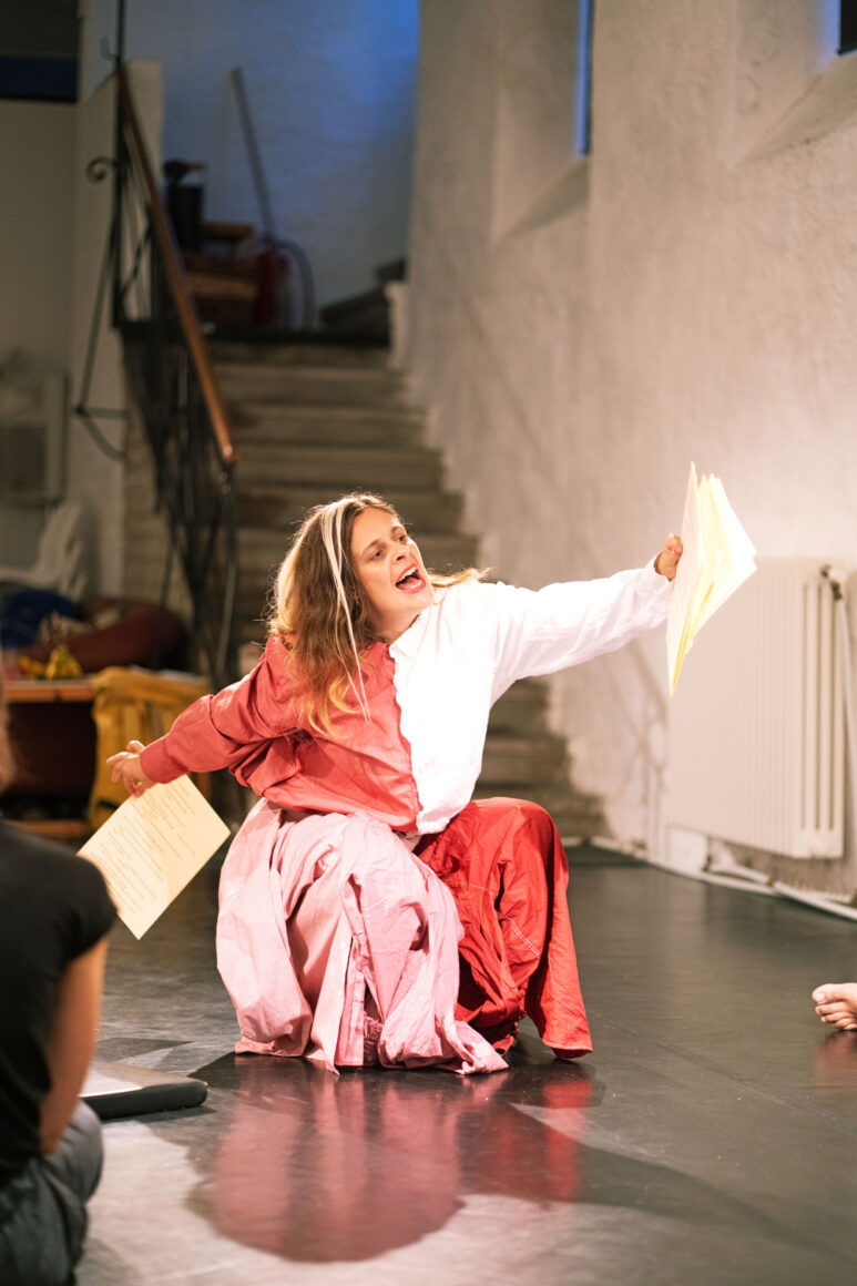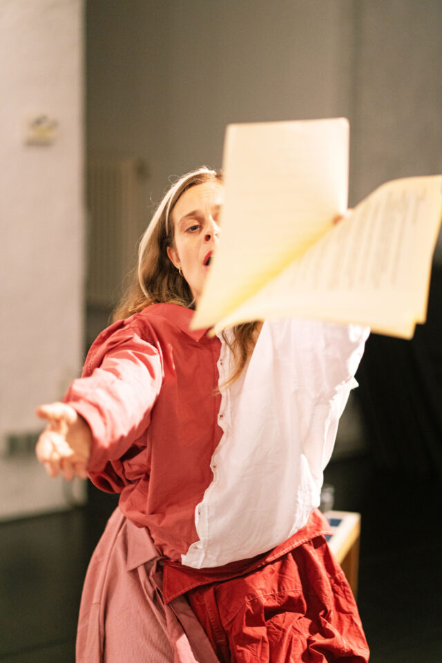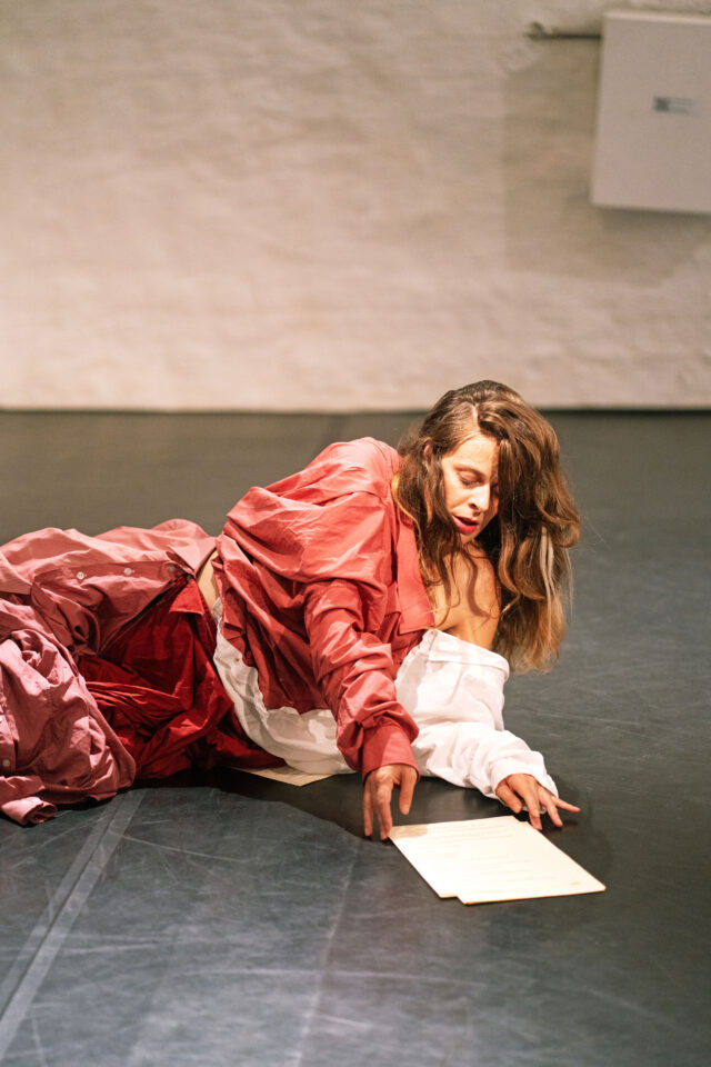 Chantal is an essayistic, visceral text choreography that radically redesigns the dispositive of the anatomical theatre exploring what the staging of the inside beyond patriarchal norms and dominant regimes of attention thinks, mobilises and imagines. It is an intimate anatomic spectacle that discloses the body as an overflowing text. Chantal is a manifold figure that unfolds from within the display of each of the voices that metabolises her quests for revealing the body making processes at stake while loving, thinking, seeing and hurting. She is a living anatomy doll that invites an audience to study alongside her how to witness a theatre from the limits of the skin, blinking between eyes-ears and sighing deep inwards to listen. She is a lesbian Venus growing from her songs of broken hearts and metaphysical poems, inviting to open up to the way we order the parts that constitute us and our identities. She is a poet slipping through an actress, a sculptor through a lover, the aphonic bailarina through a teacher. Chantal opens and dissects her body of many bodies reciting text from one body into the next body, one language into the next language, one register into the next register.