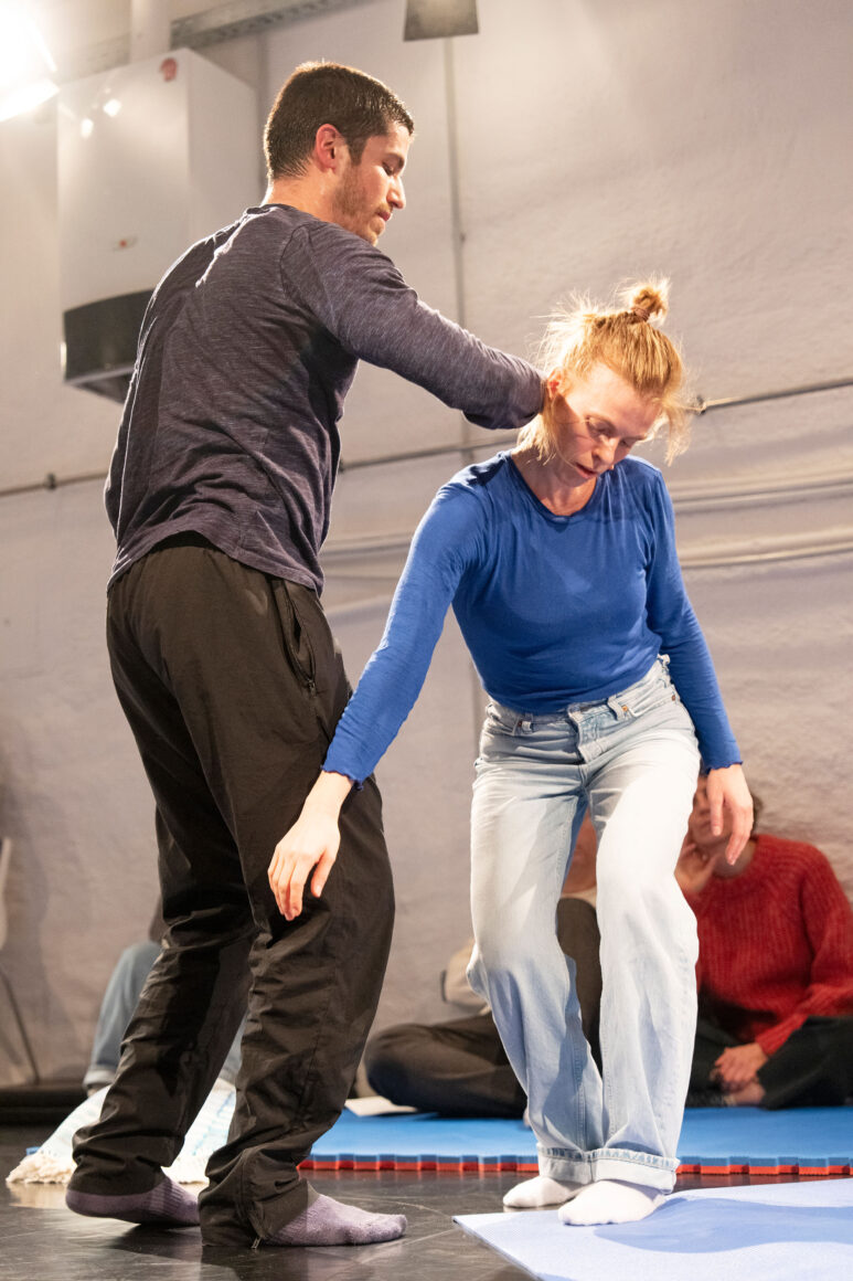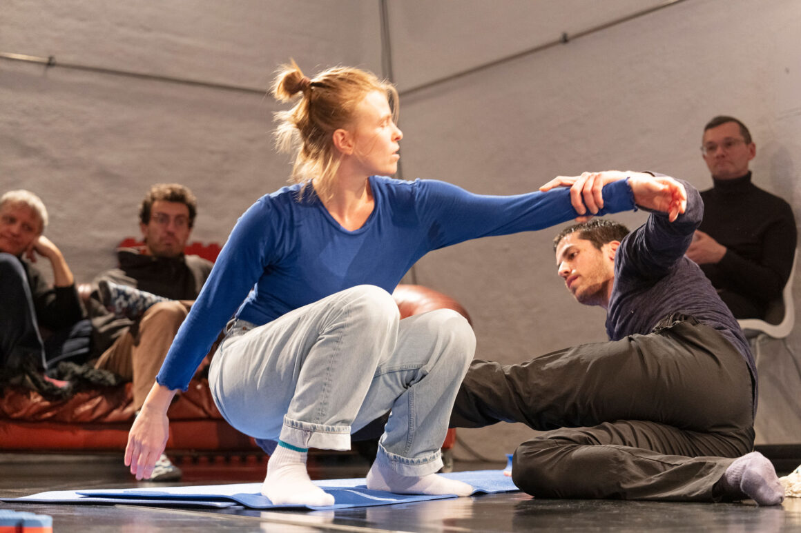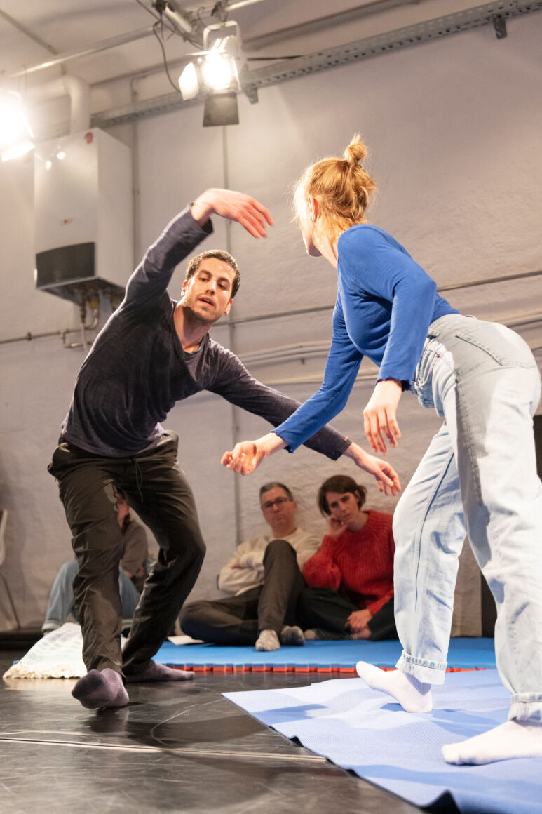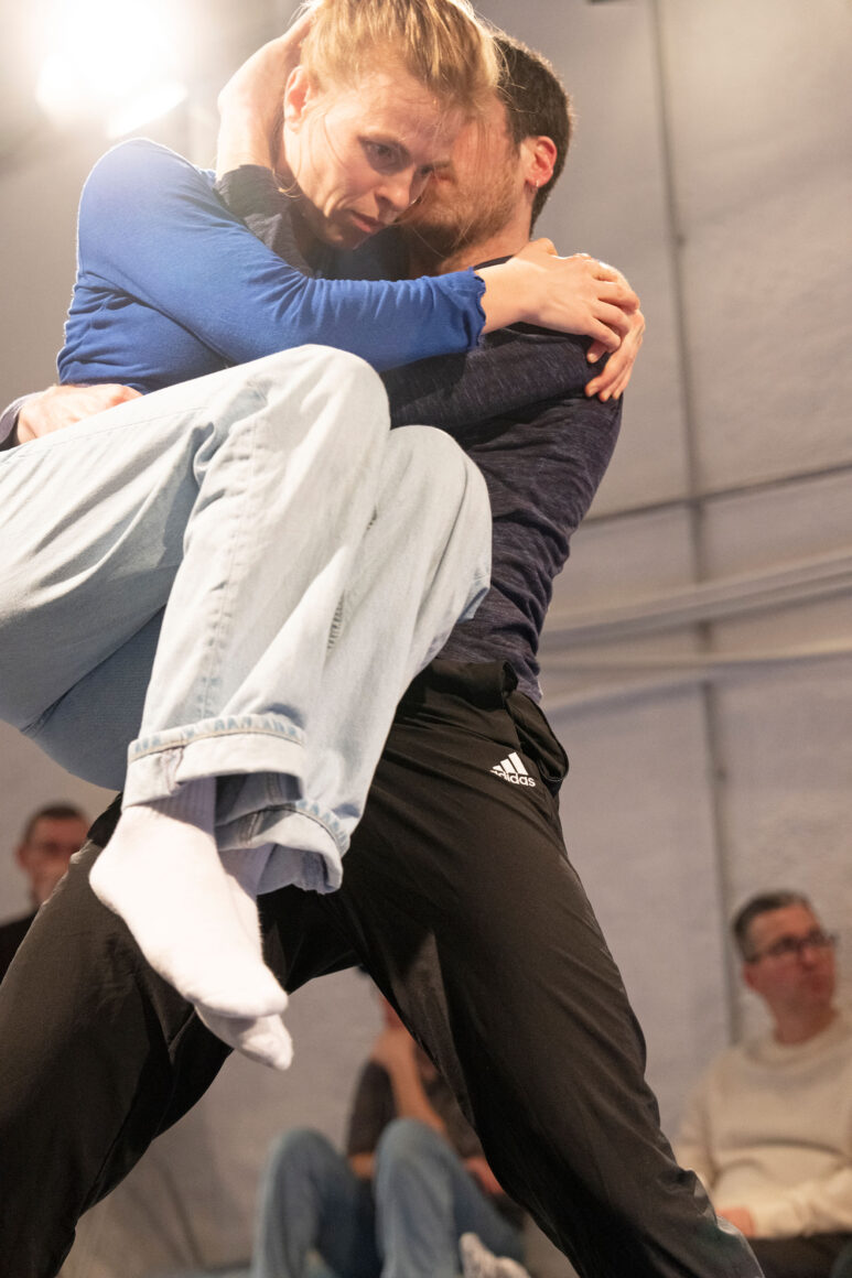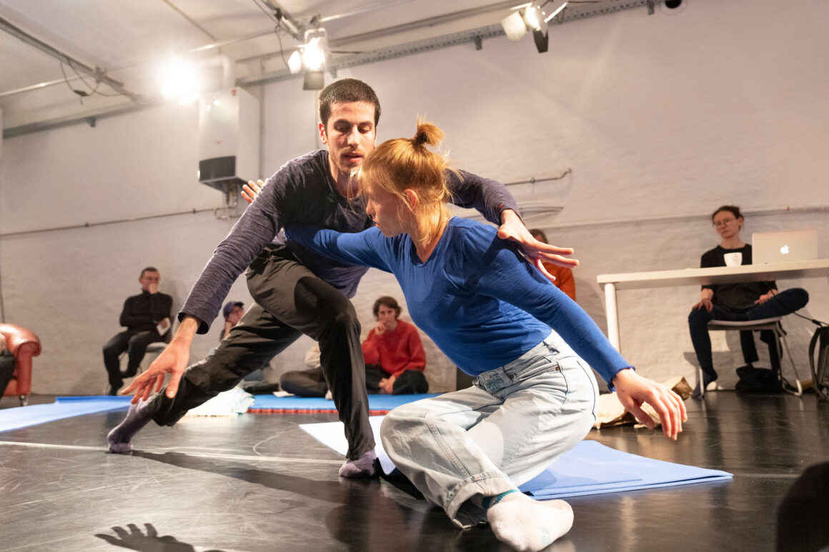 What if we focus on the processes of transmission and exchange as generative tasks and let them become the material? What emerges from such a feeding-forward-looping, from the attempts of physical understanding, getting close and joining each other? What happens in the attempt to share and embody information, pass on patterns, phrases, movement – and make them available to the other? This care and curiosity of sharing and transmitting information between two dancers inform our entanglements with meanings and materials: Caring for each other and carrying each other amalgamate throughout our practice.