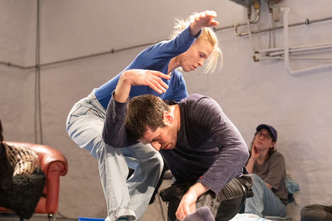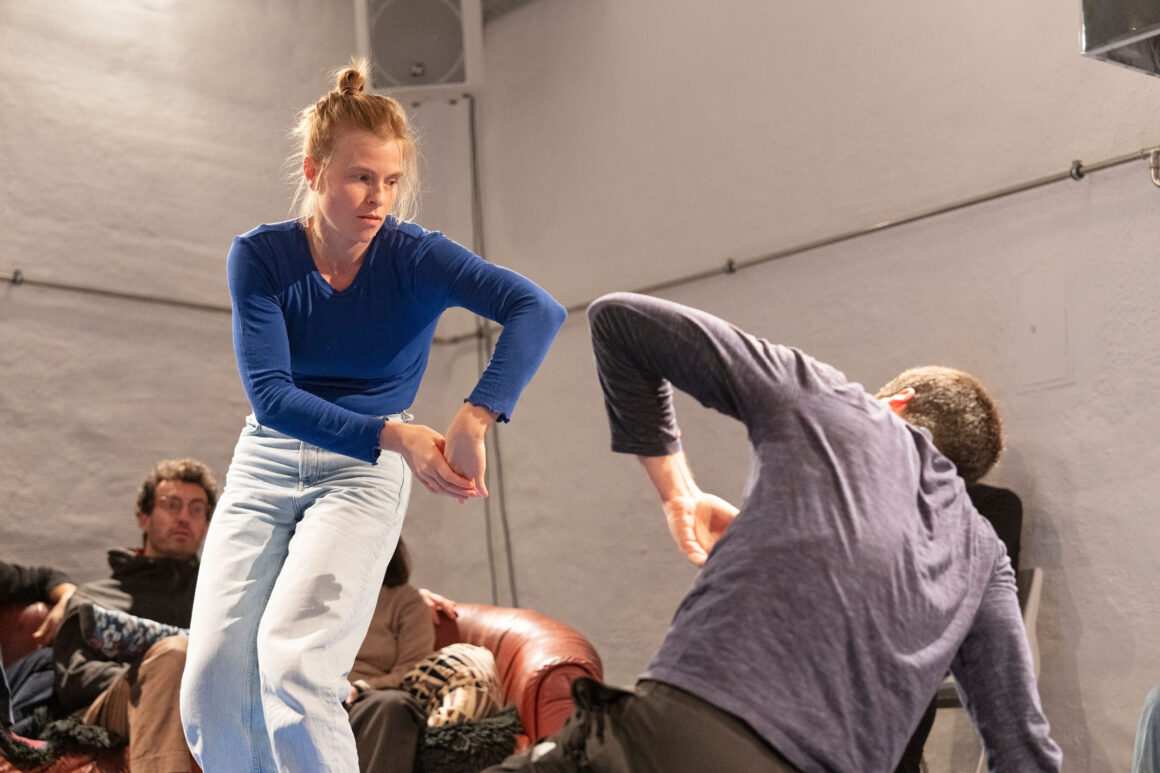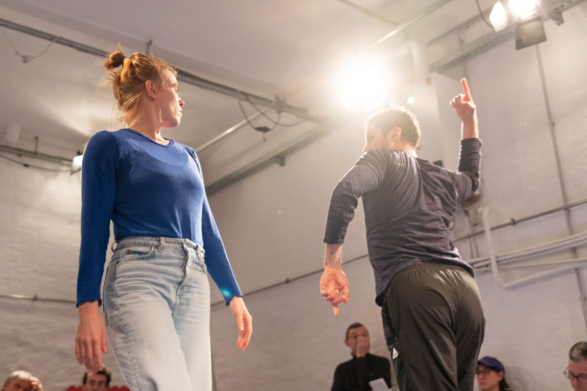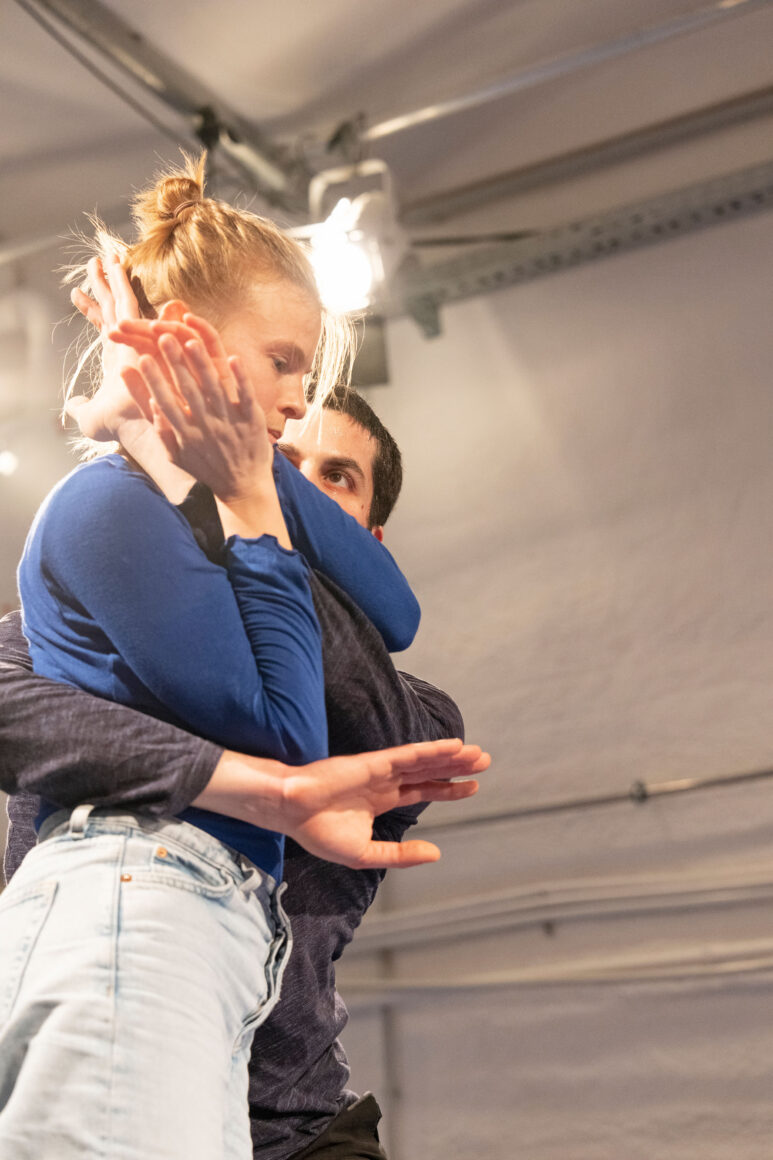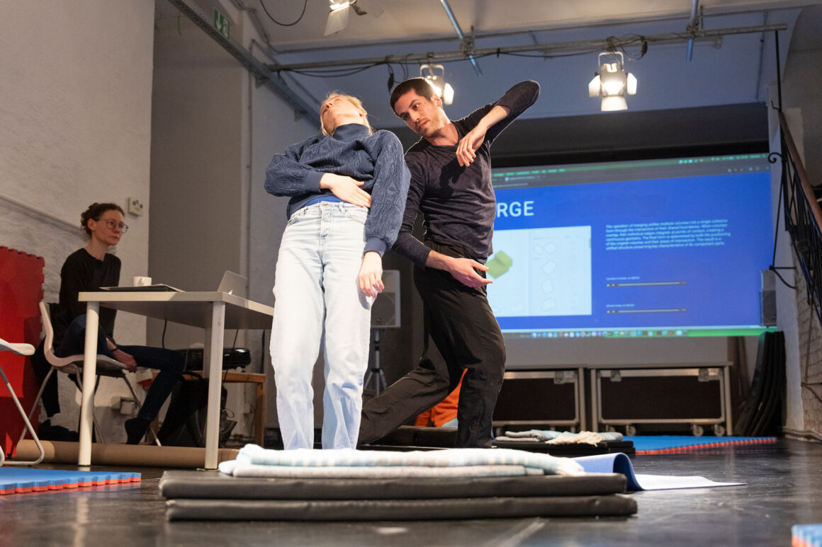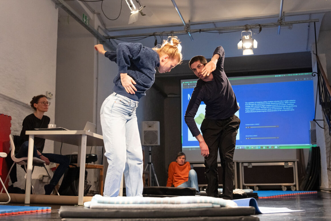 What if we focus on the processes of transmission and exchange as generative tasks and let them become the material? What emerges from such a feeding-forward-looping, from the attempts of physical understanding, getting close and joining each other? What happens in the attempt to share and embody information, pass on patterns, phrases, movement – and make them available to the other? This care and curiosity of sharing and transmitting information between two dancers inform our entanglements with meanings and materials: Caring for each other and carrying each other amalgamate throughout our practice.