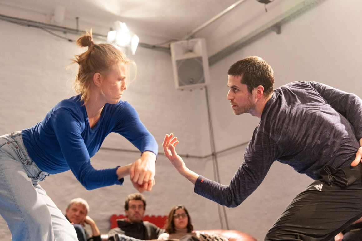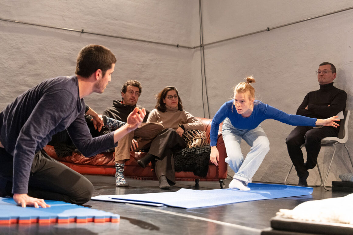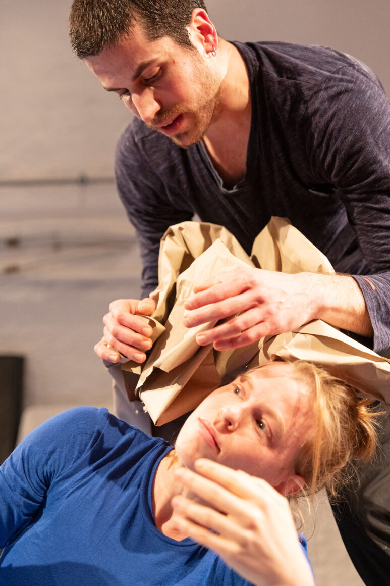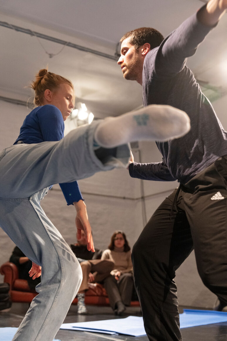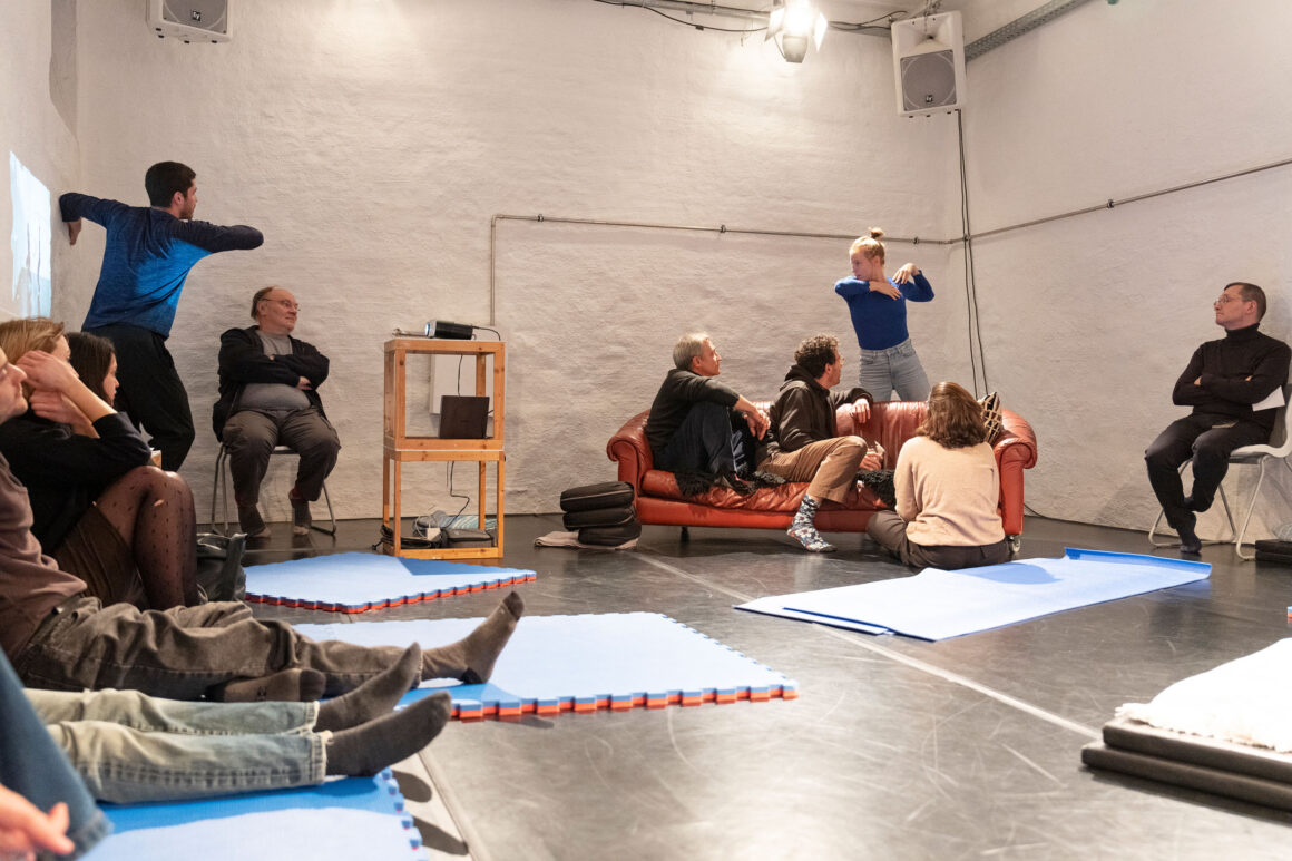 What if we focus on the processes of transmission and exchange as generative tasks and let them become the material? What emerges from such a feeding-forward-looping, from the attempts of physical understanding, getting close and joining each other? What happens in the attempt to share and embody information, pass on patterns, phrases, movement – and make them available to the other? This care and curiosity of sharing and transmitting information between two dancers inform our entanglements with meanings and materials: Caring for each other and carrying each other amalgamate throughout our practice.