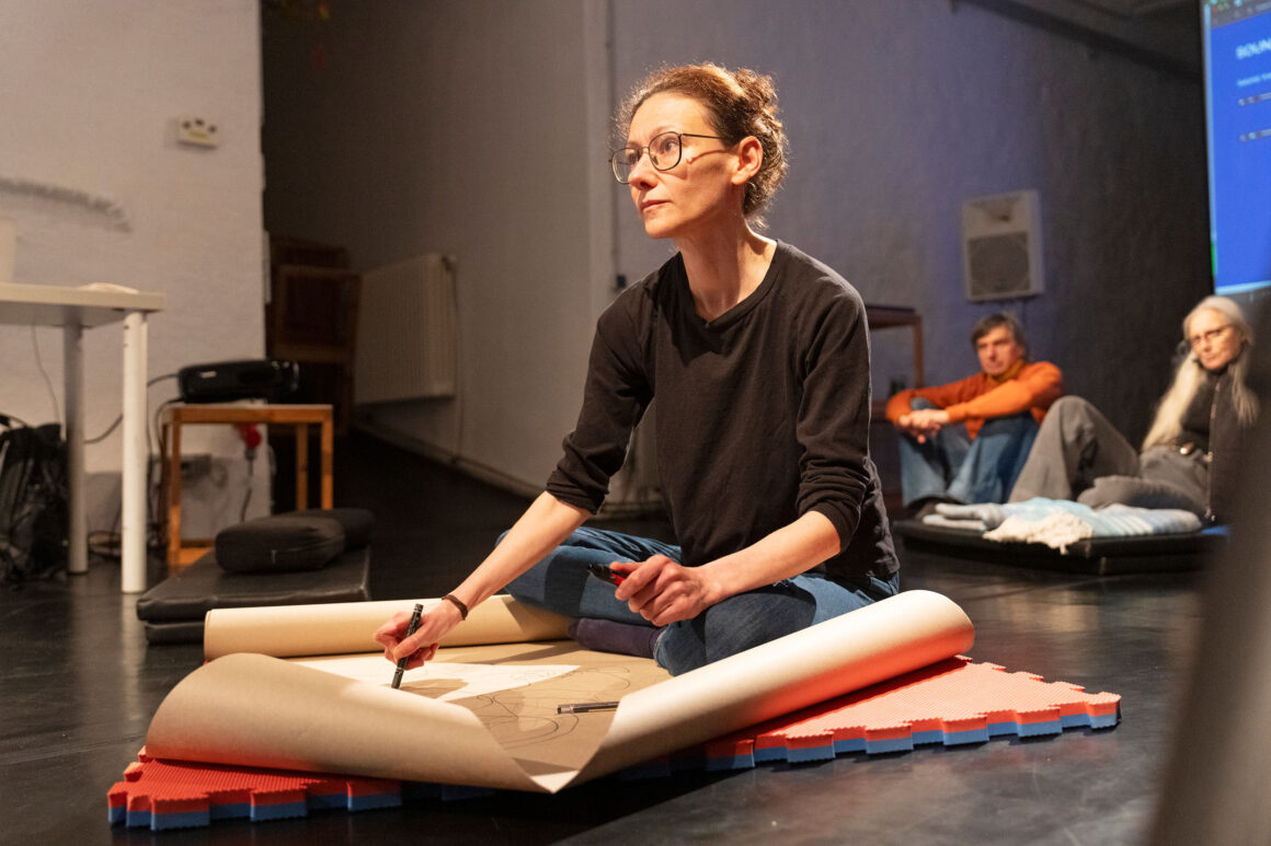 By experimenting with different spatial scores, we explore the elasticity of a landscape as an undisciplined event of spatial multiplicity. Drawing on Doreen Massey’s discussion of undisciplined landscapes (a term she borrows from anthropologist Barbara Bender), we engage both semantically and materially with words, sounds, lines, tactile and non-tactile agencies, transgressing the geometry of body and space. In this context, the medium drawing becomes a method for experiencing, tracing, transposing and analysing spatial events and formations, activating multiple layers of interaction between performers and sites.
