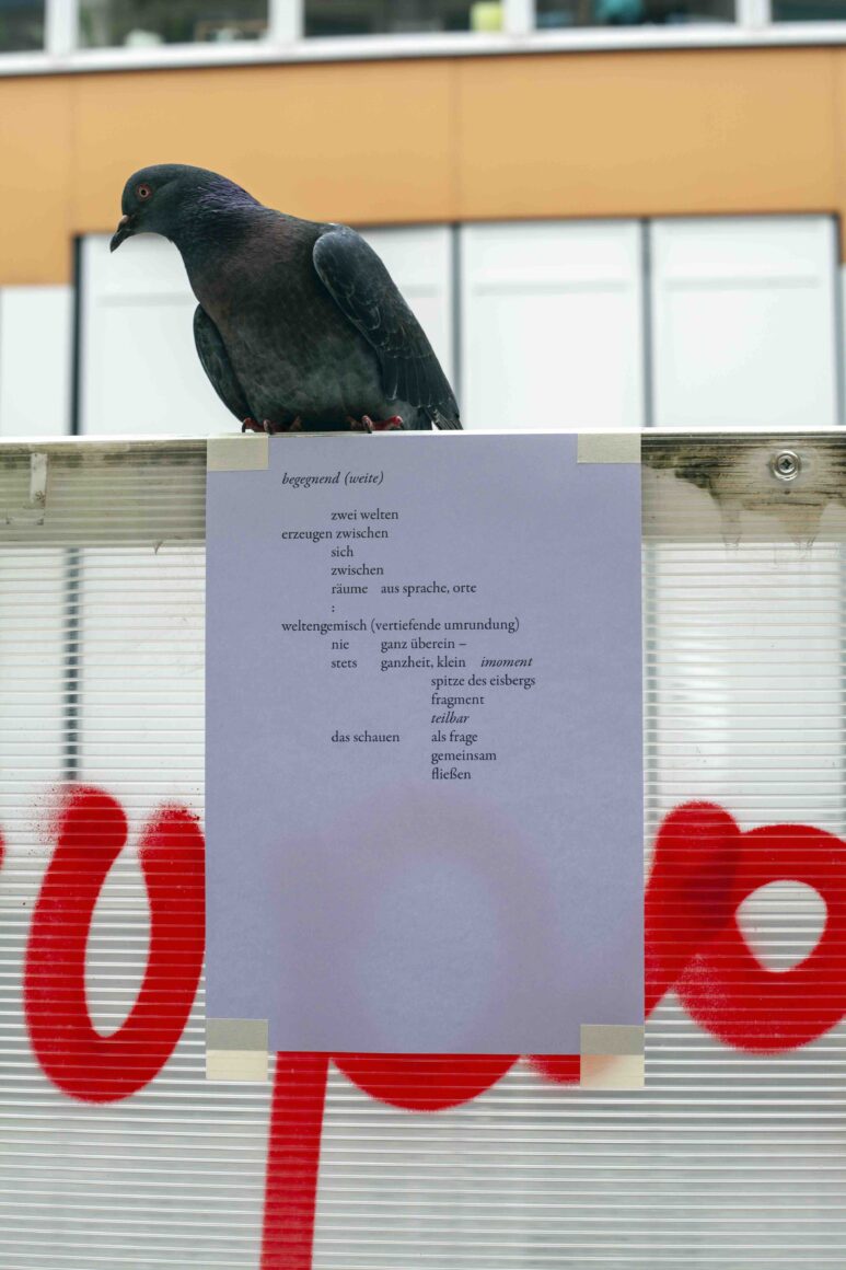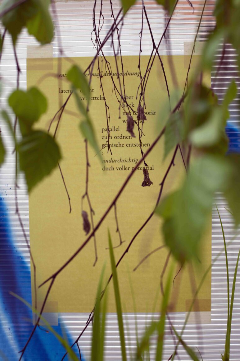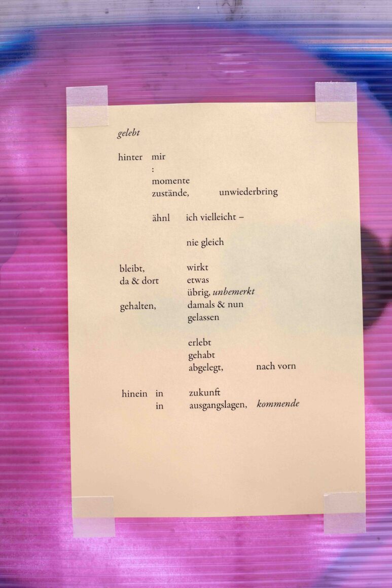 In a performative montage, poems from Benedikt Steiner’s book spuren in einem are arranged in space and collectively cross-read. This opens up unimagined spaces of meaning, from poetic dialogues until vibrant cacophony. Gradually, the boundaries between production and consumption of artistic work blur, and the common creation of significance thus becomes a performative act – always fragile, but all the more vivid.